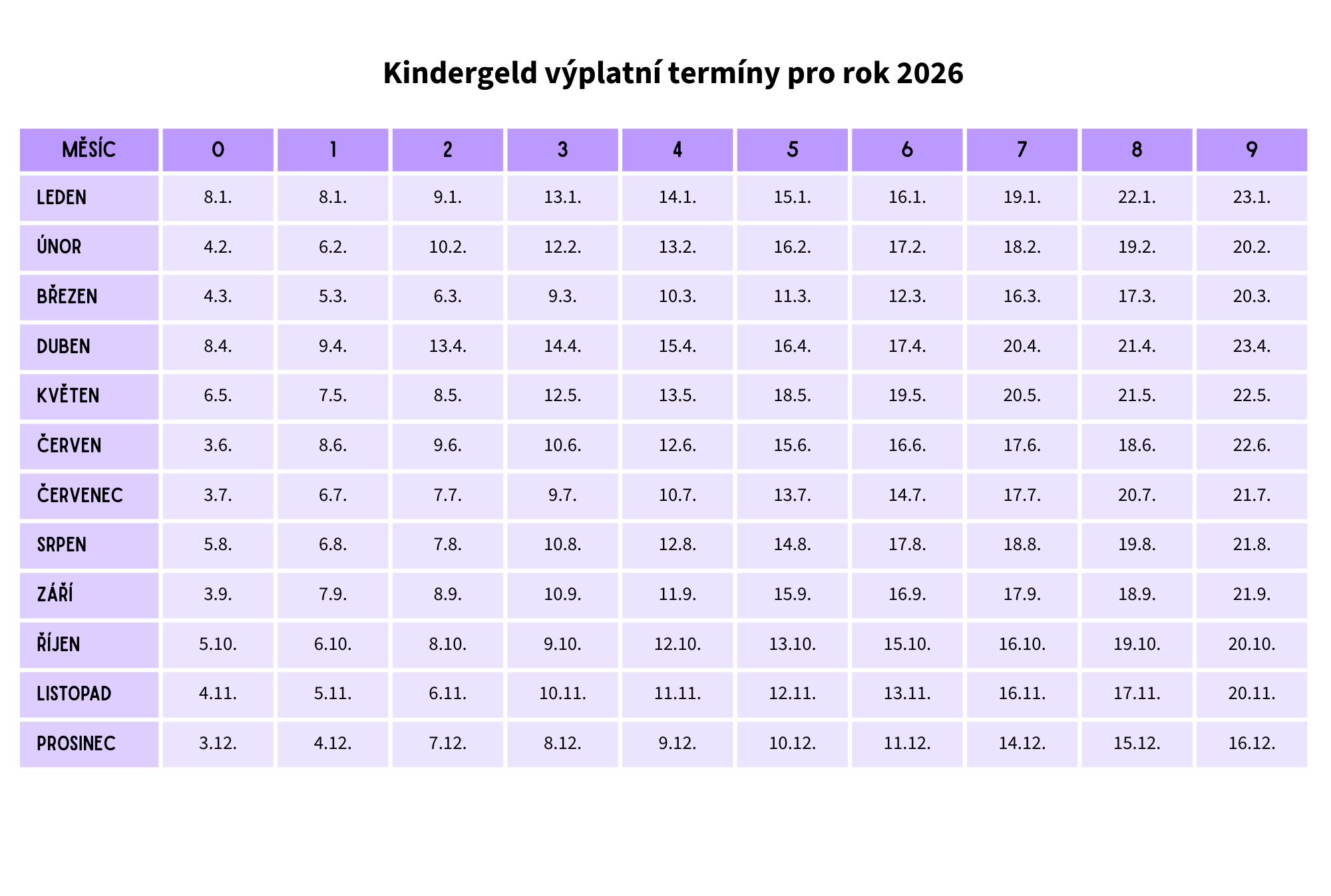 V následujícím přehledu se můžete podívat, které výplatní termíny platí v roce 2026 pro poslední číslici Vašeho čísla přídavku na dítě.